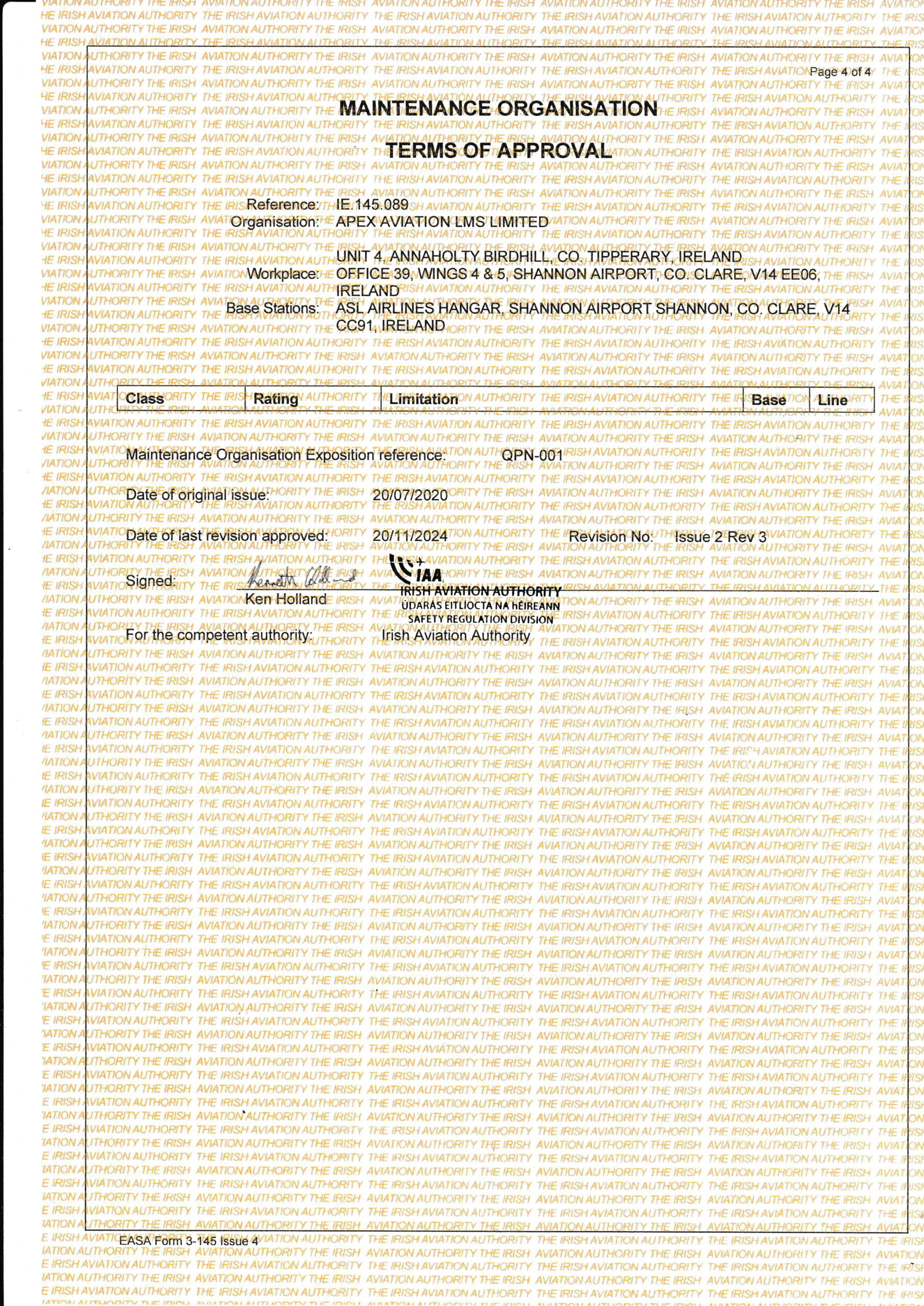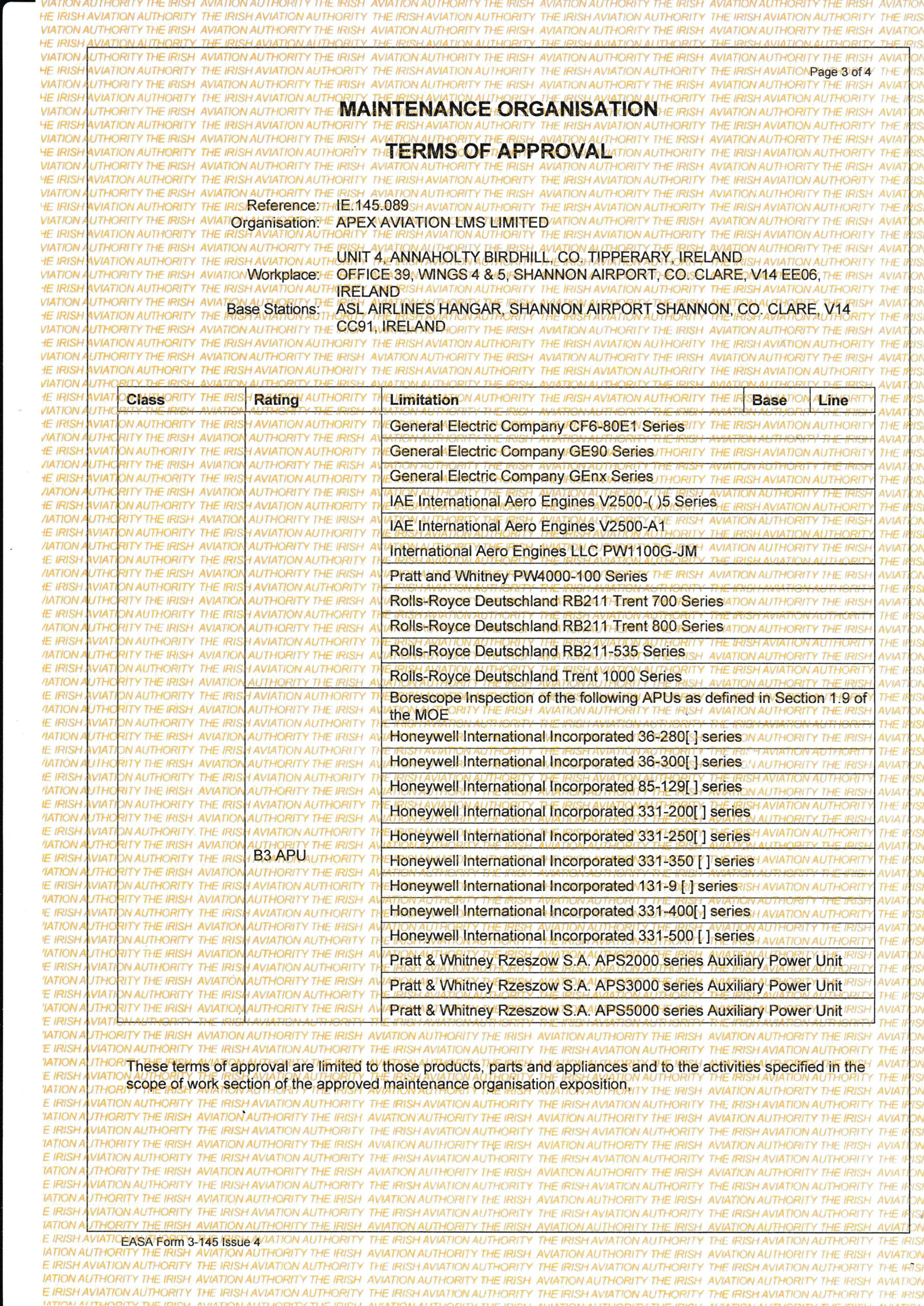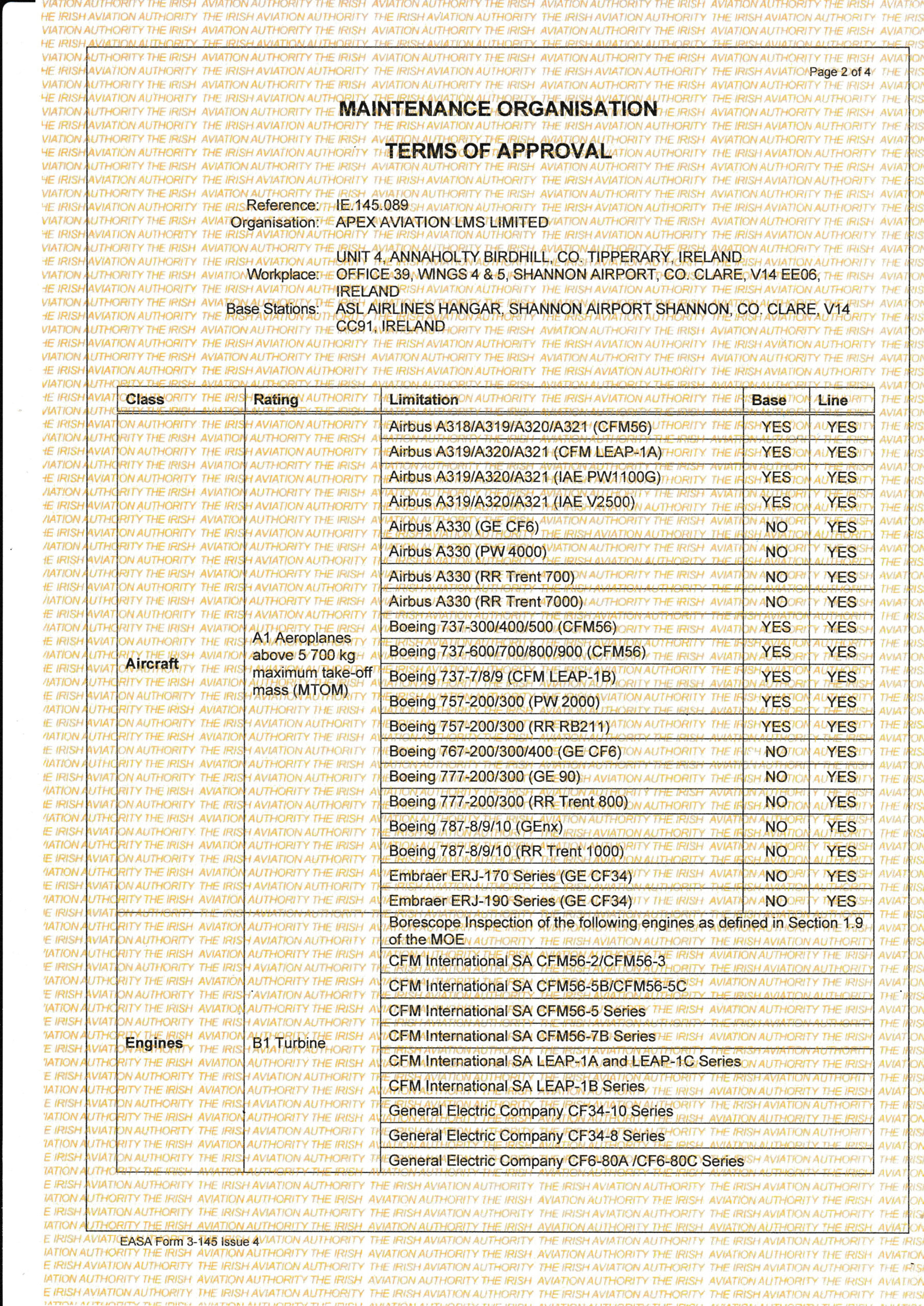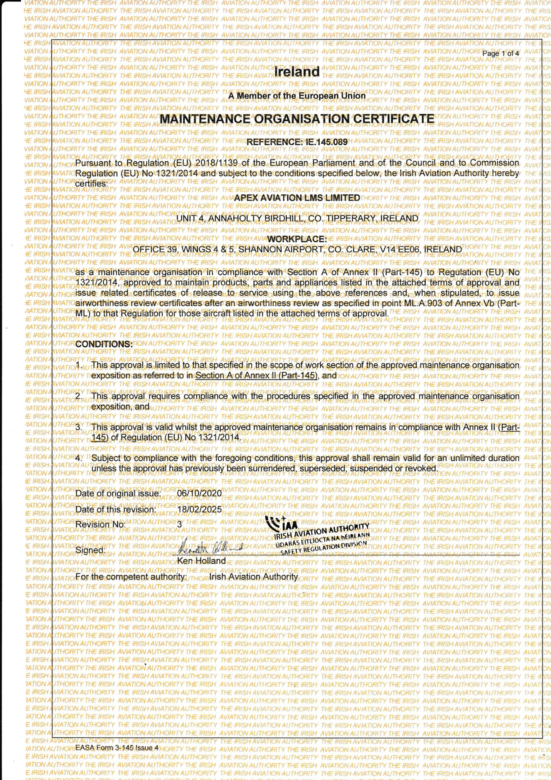 Based at Shannon Airport Ireland Apex Aviation LMS Ltd is an EASA (European Aviation Safety Agency) “A1” Aircraft rated approved provider of line maintenance services up to “A” check for lessor / airline owners with oversight provided by the IAA (Irish Aviation Authority).