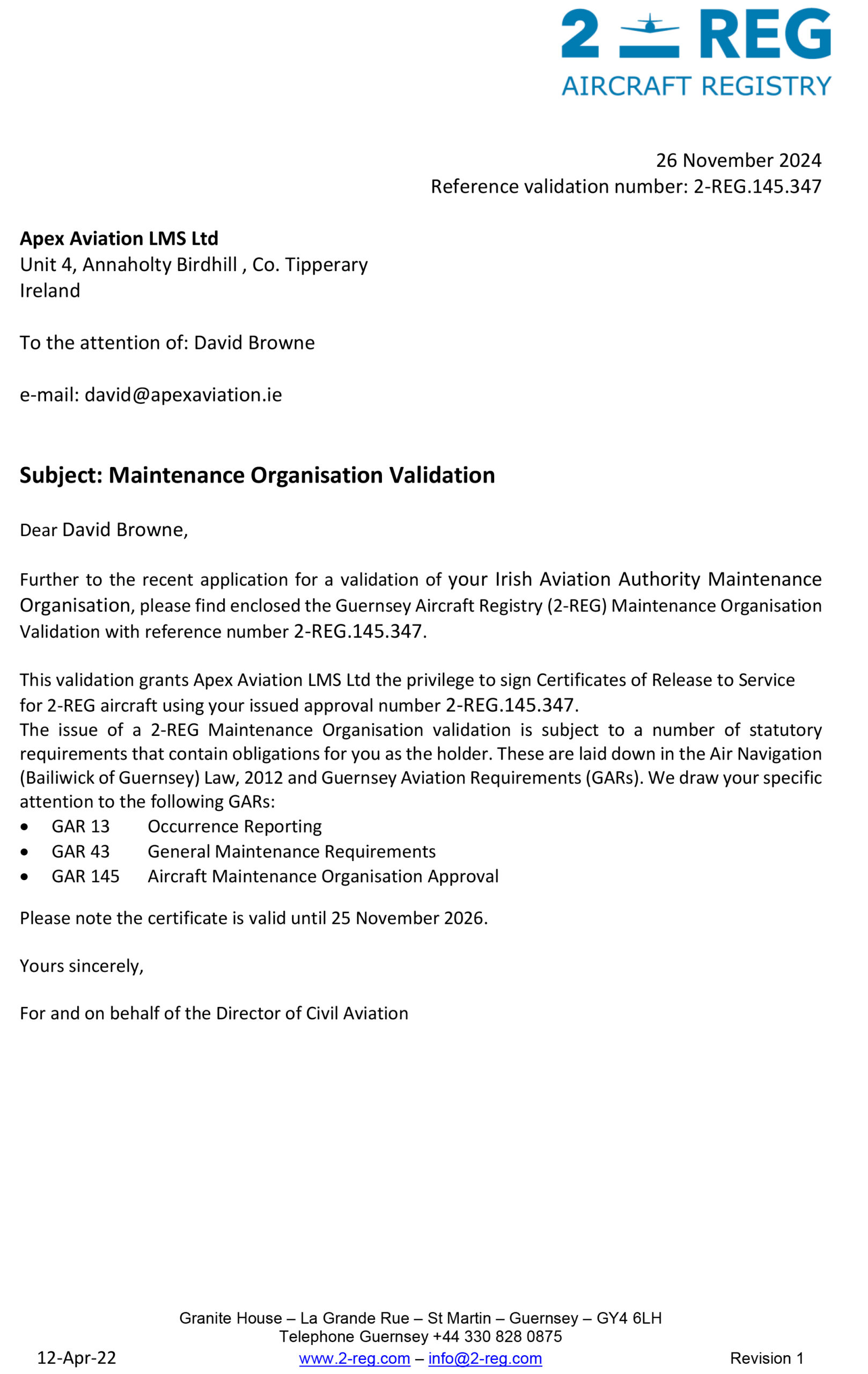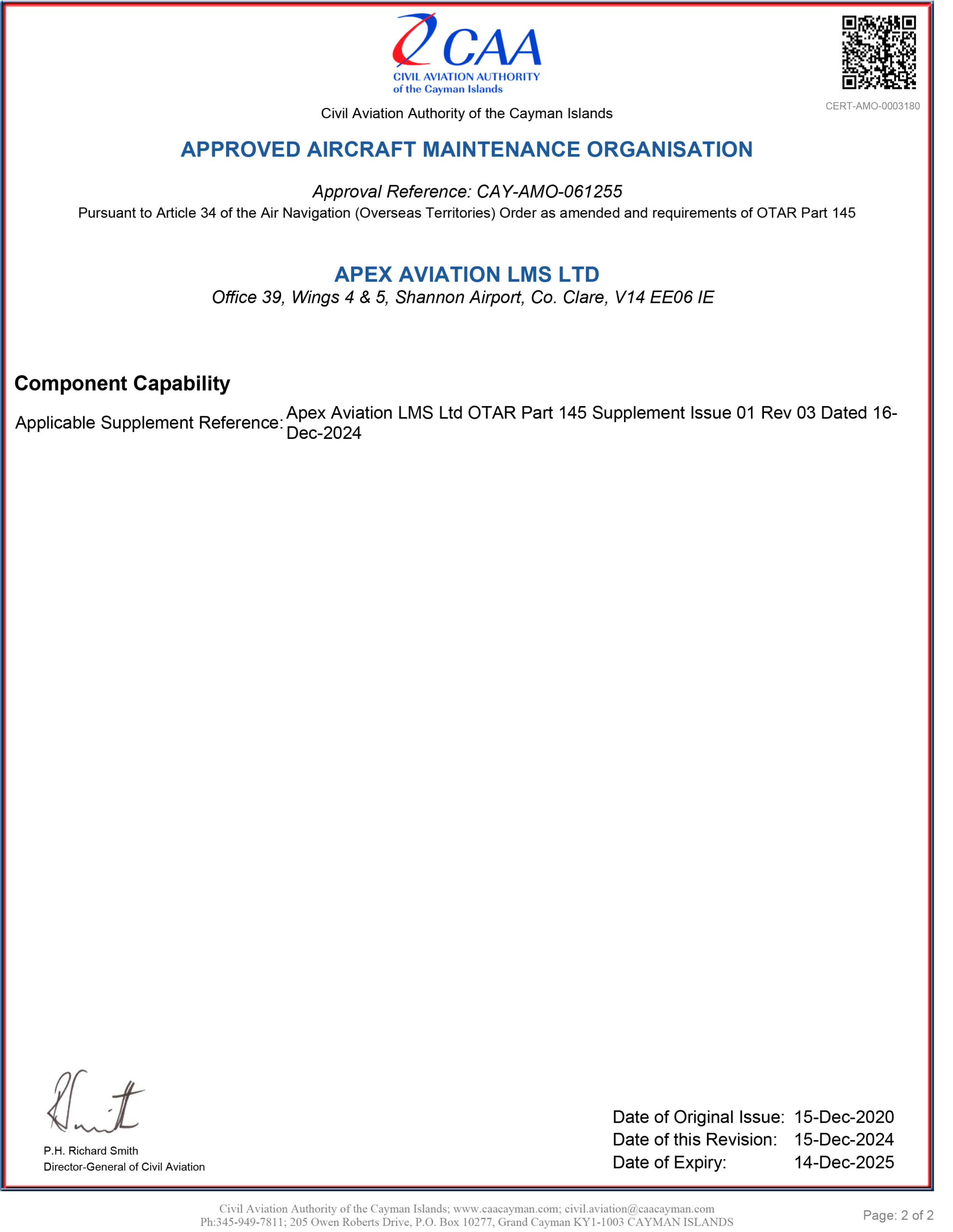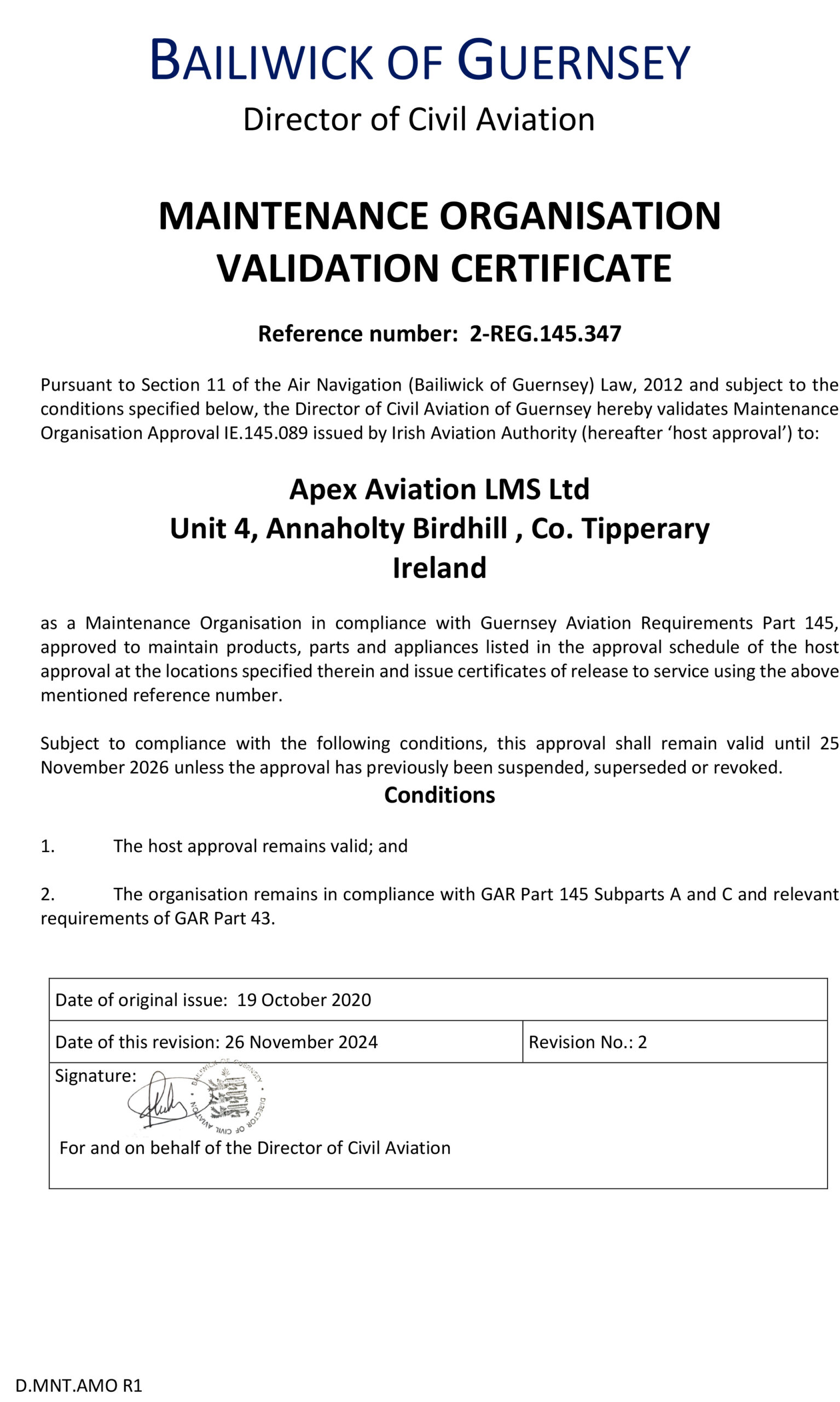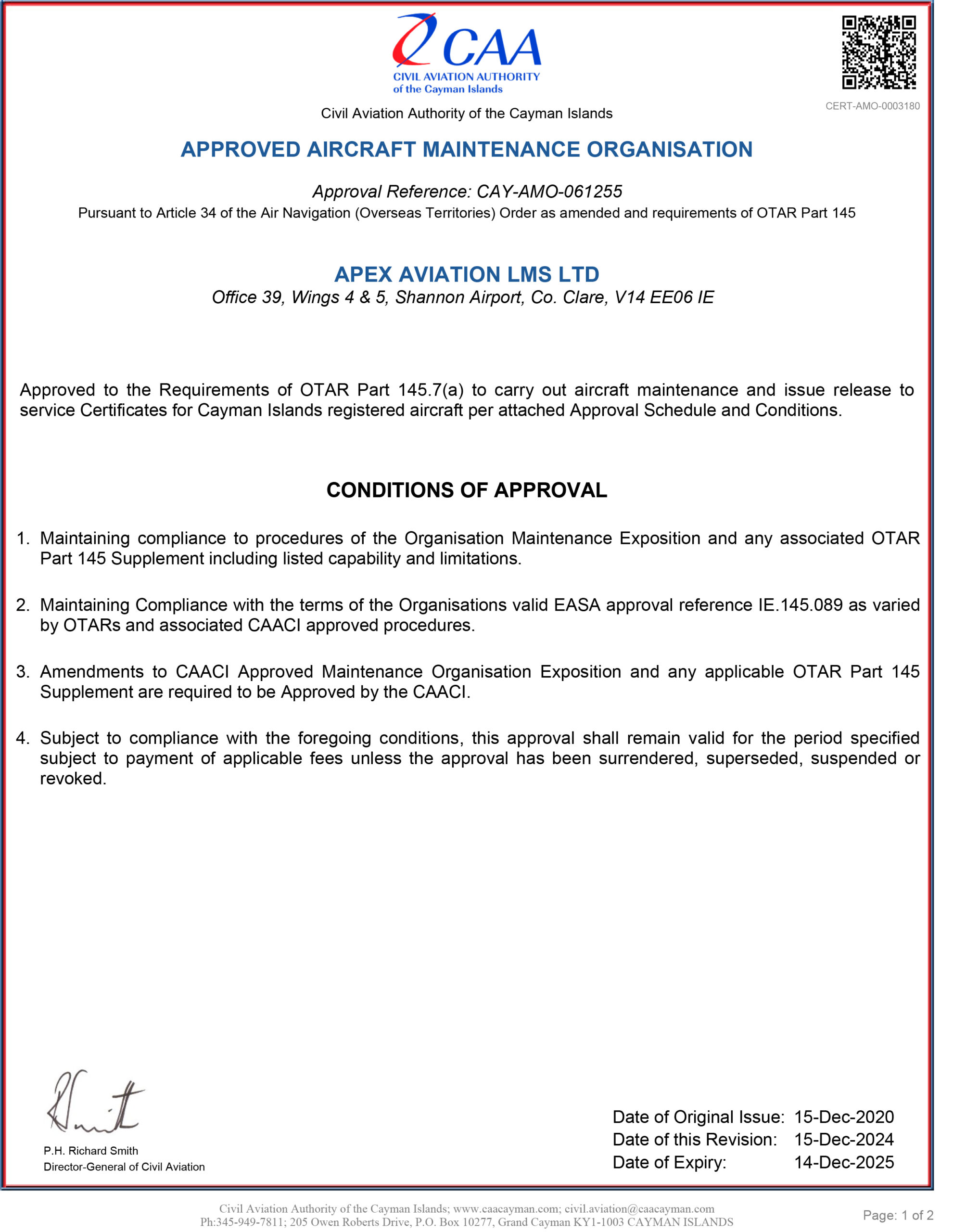 Based at Shannon Airport Ireland Apex Aviation LMS Ltd is an EASA (European Aviation Safety Agency) “A1” Aircraft rated approved provider of line maintenance services up to “A” check for lessor / airline owners with oversight provided by the IAA (Irish Aviation Authority).