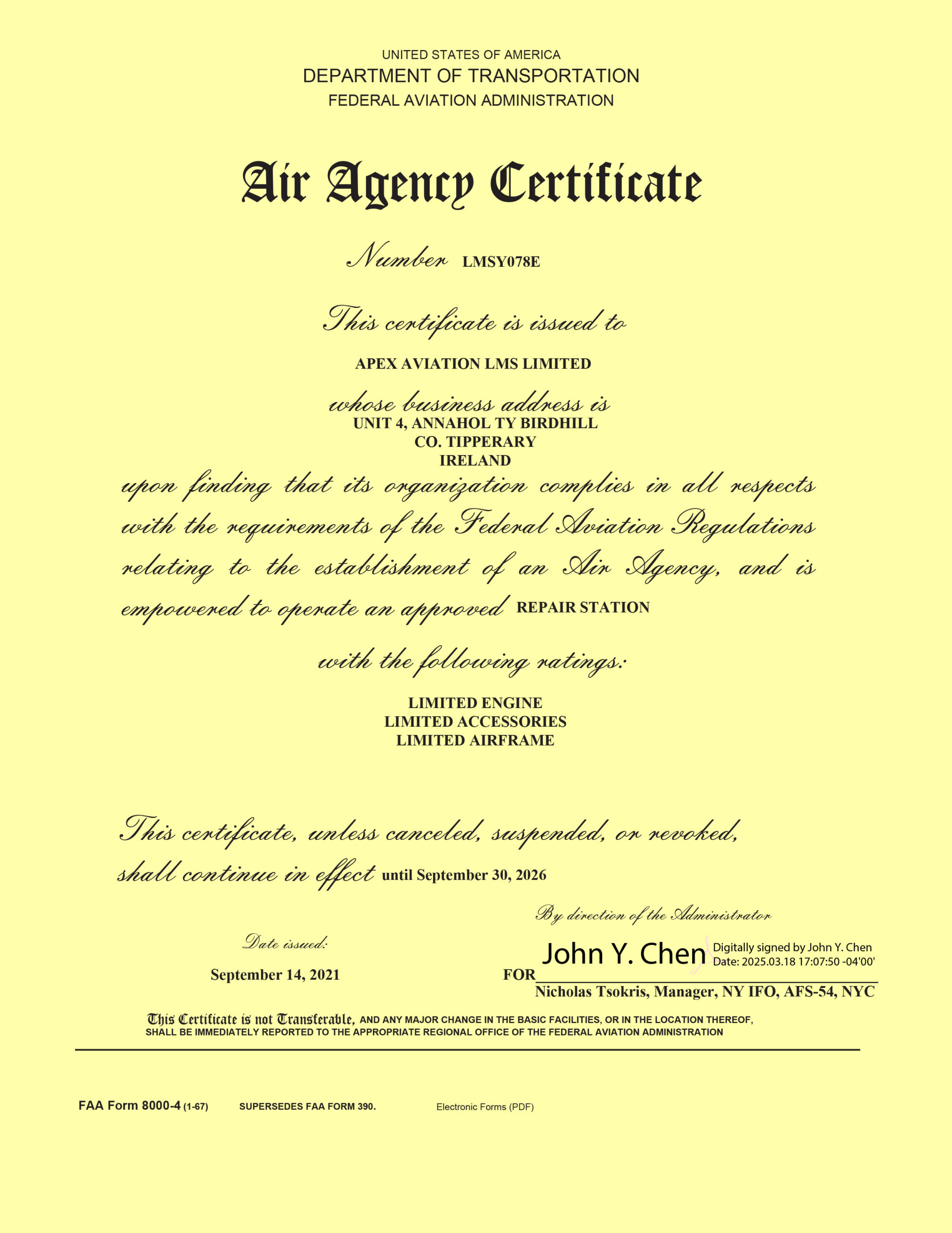FAA Air Agency Certificate: LMSY078E Dated 18-Mar-2025